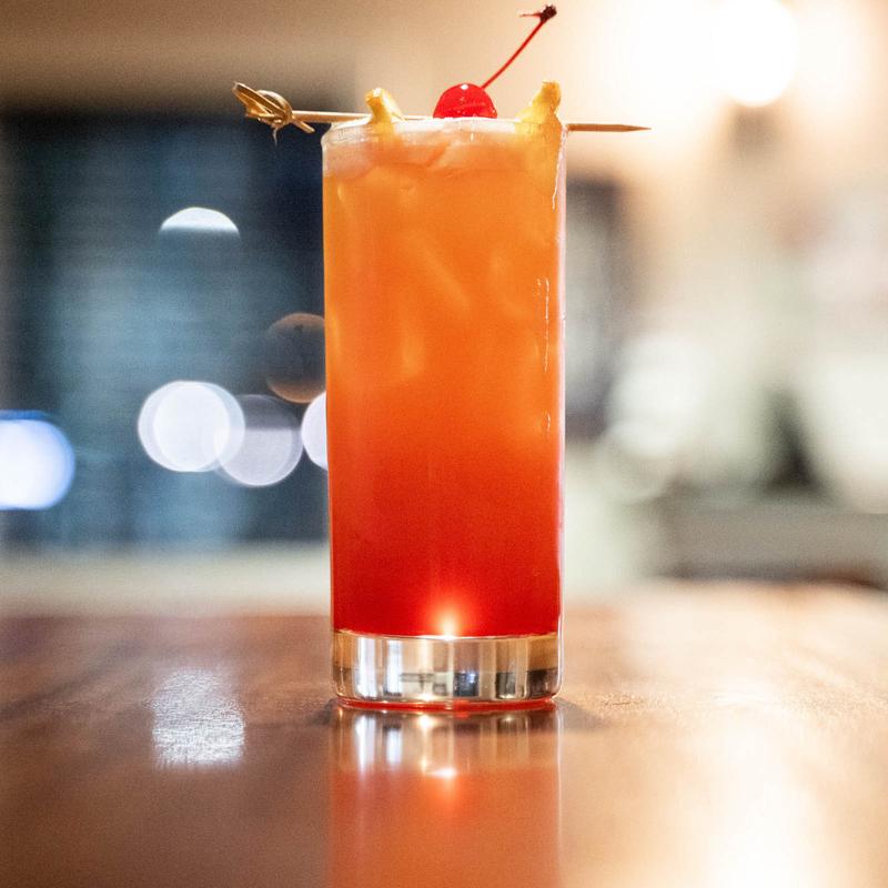 Goslings Black rum, Whalers Coconut rum, house-made sour mix, pineapple juice, cream of coconut, Amarena cherry and brown sugar rim